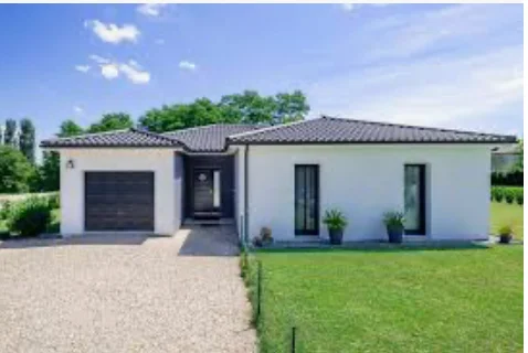 Cette maison contemporaine de plain-pied séduit par son architecture épurée et son design actuel. Sa façade blanche associée à un toit en tuiles sombres lui confère un style moderne et harmonieux.